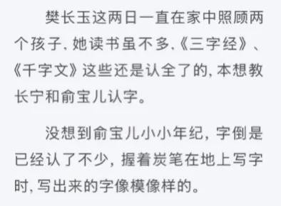 所以小说中,长玉是识字的。提到她读书不多,那是因为没有专门去学。但是《三字经》《千字文》是认全了的,还提到想教长宁和宝儿识字。
